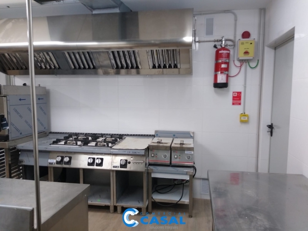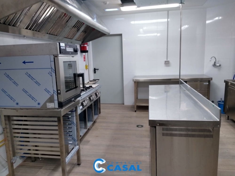 Zona cocción: Horno convección compacto, 4 fuegos abiertos, frytop cromo duro.