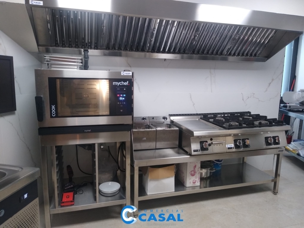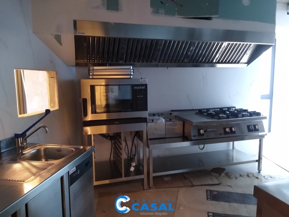 Zona Cocción: Cocina y frytop gama Kore 700. Freidoras snack. Horno Mychef 6 bandejas. Campana. Extracción cocina.