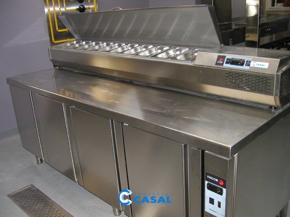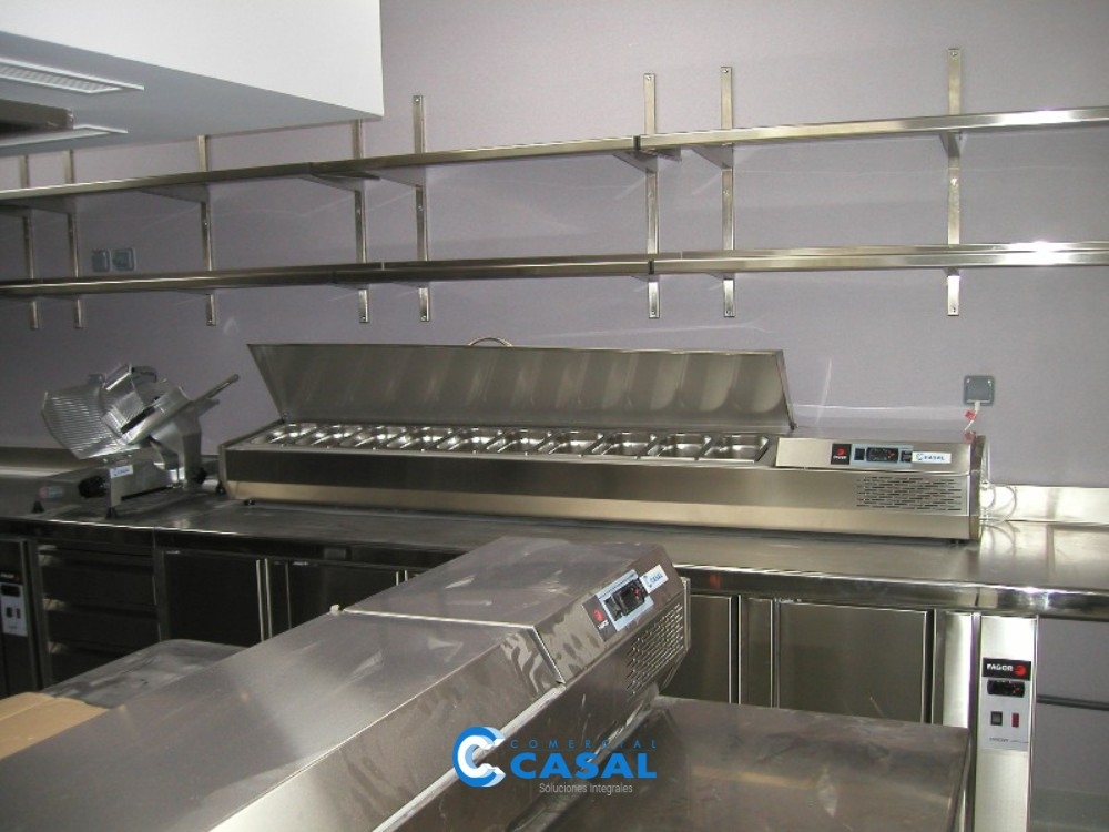*Mesas frias de almacenamiento integradas bajo encimera pieza única, y vitrinas superiores para ingredientes de rotación.