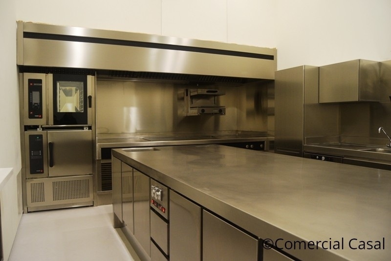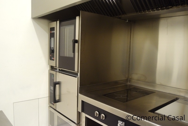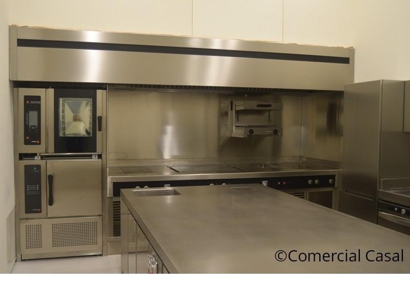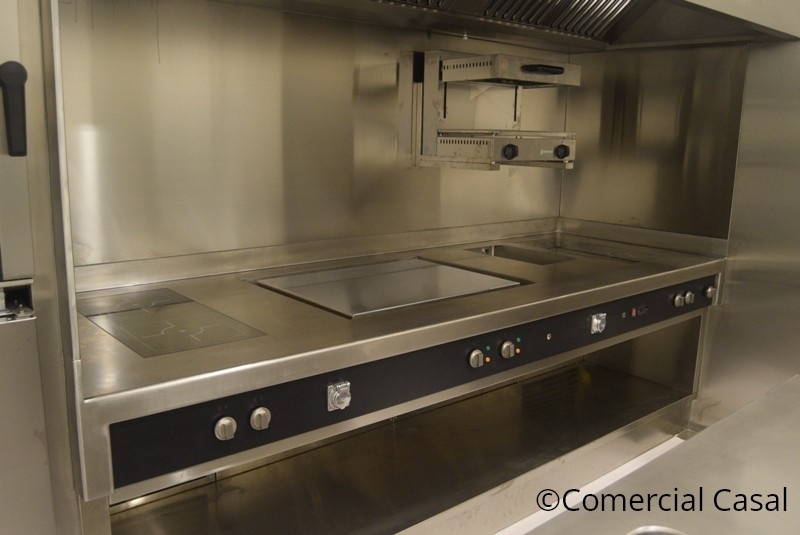 *Cocina con encimera plano único Symphony. Encimera 3 mm. 4 Fuegos inducción, Frytop cromo duro y Baño maría.