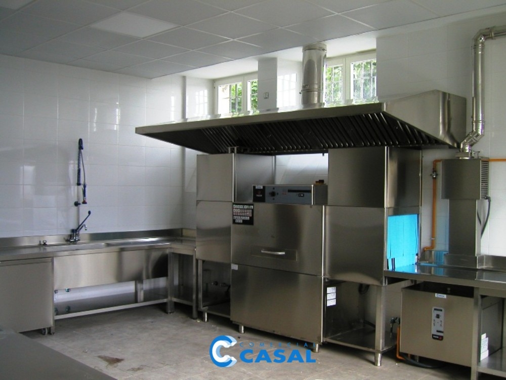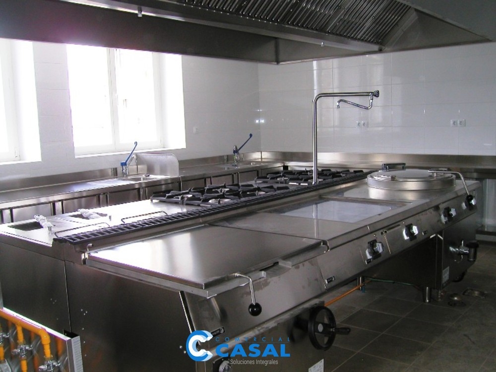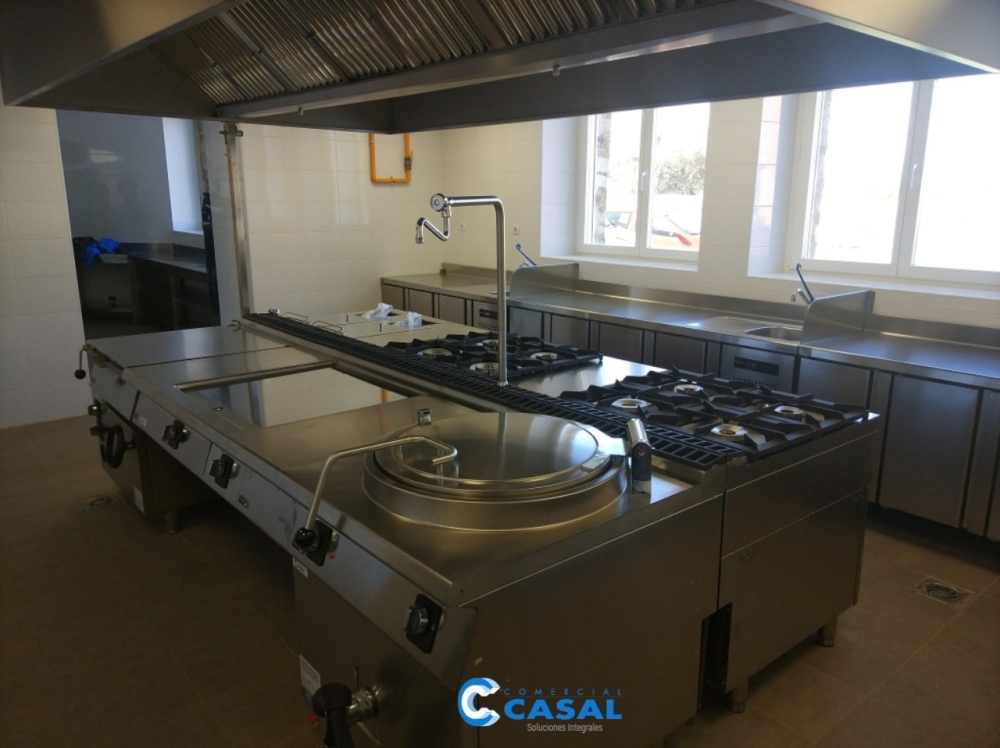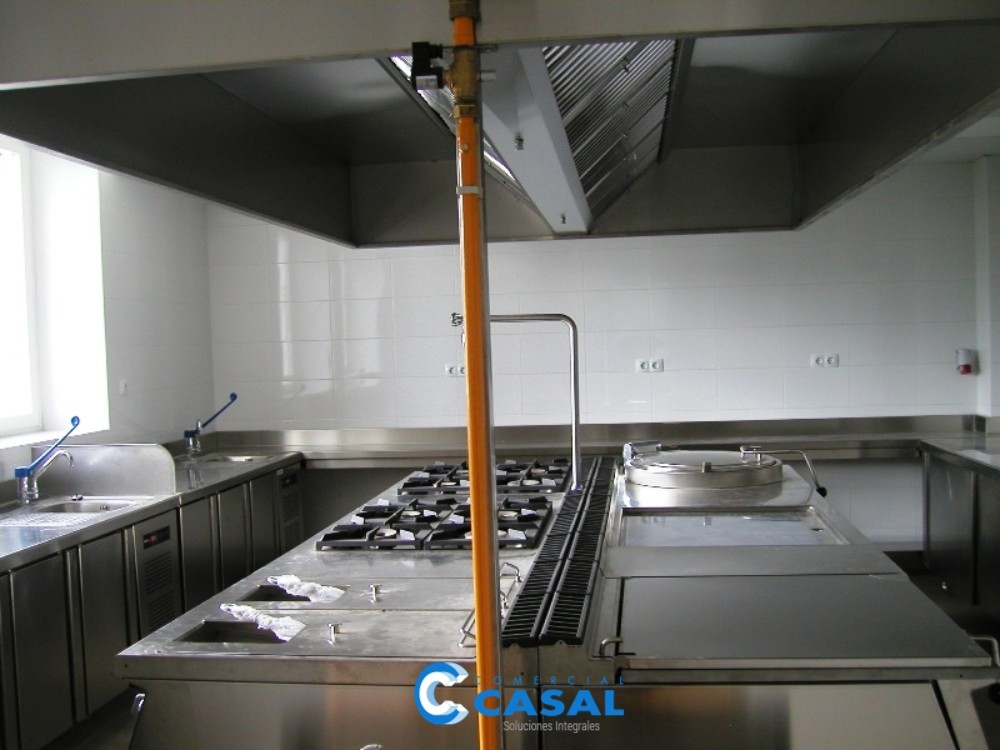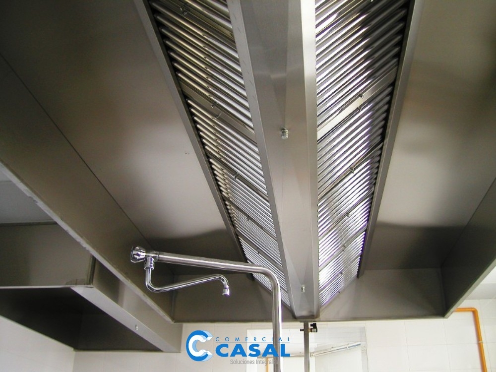 Extracción: Campana central para bloque cocción. Campana mural para hornos convección. Chimeneas evacuación gases EI30. Conductos acero aportación aire.
