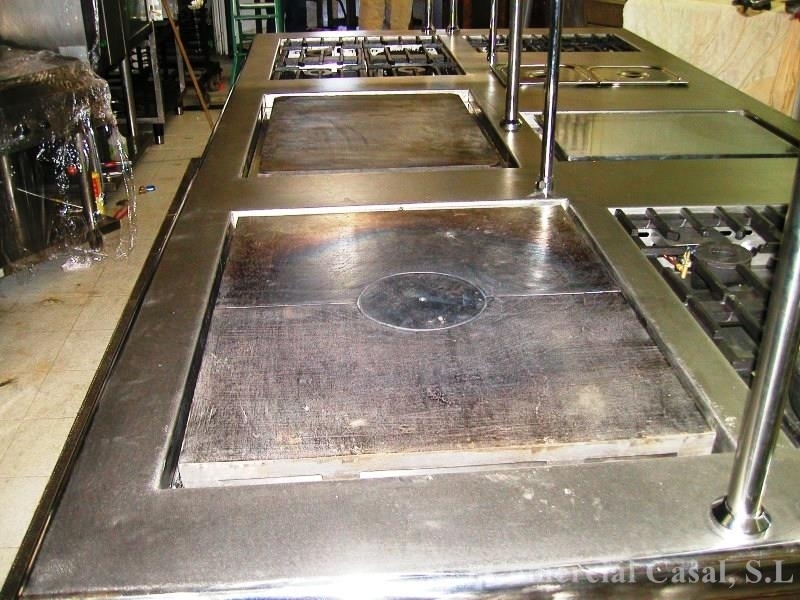 *Cocina central con encimera en plano único. Fuegos abiertos con bandeja y sistema de agua, Frytops, Freidoras, Todo-Plancha, Baño maría y Mesados.